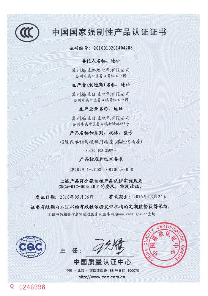 SLC30模數(shù)化插座資質(zhì)證書