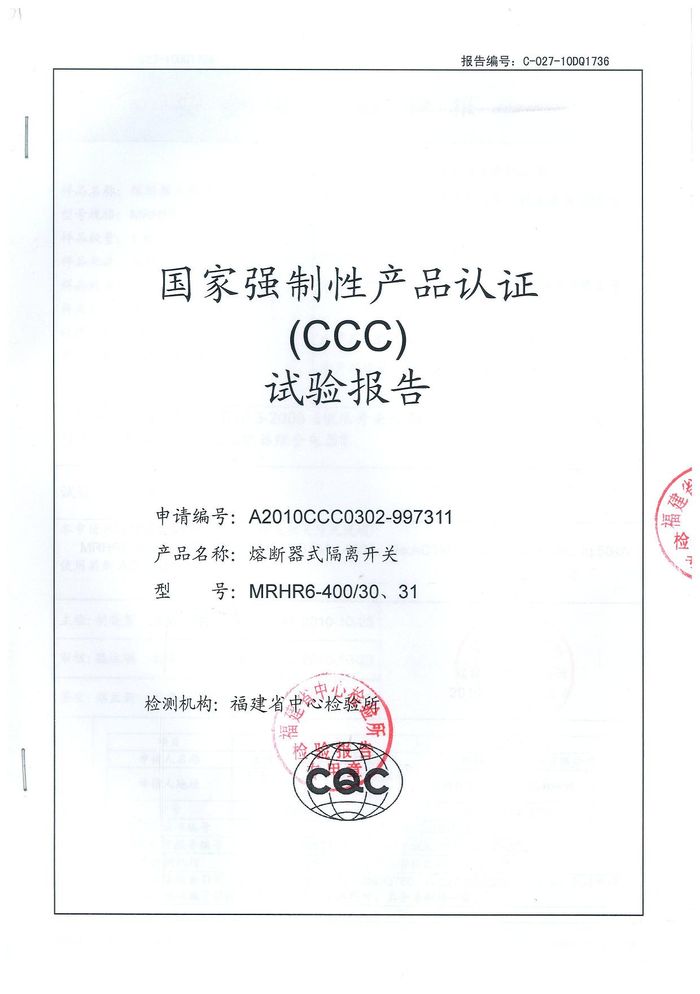 MRHRR-400熔斷隔離開(kāi)關(guān)資質(zhì)證書(shū)