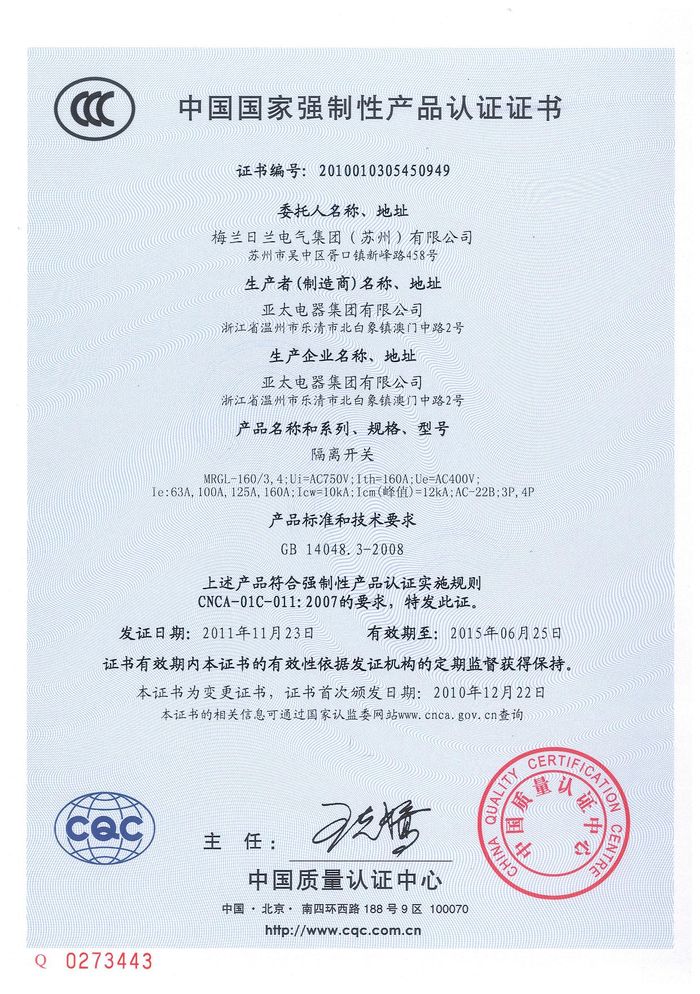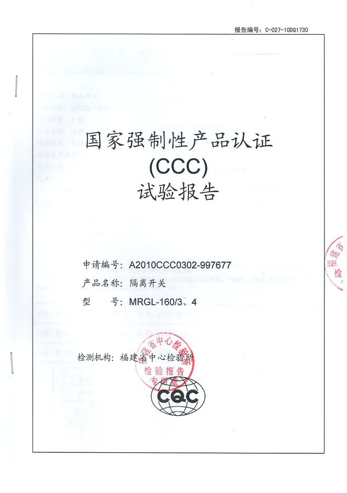 MRGL-160隔離開關資質(zhì)證書