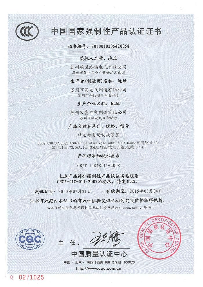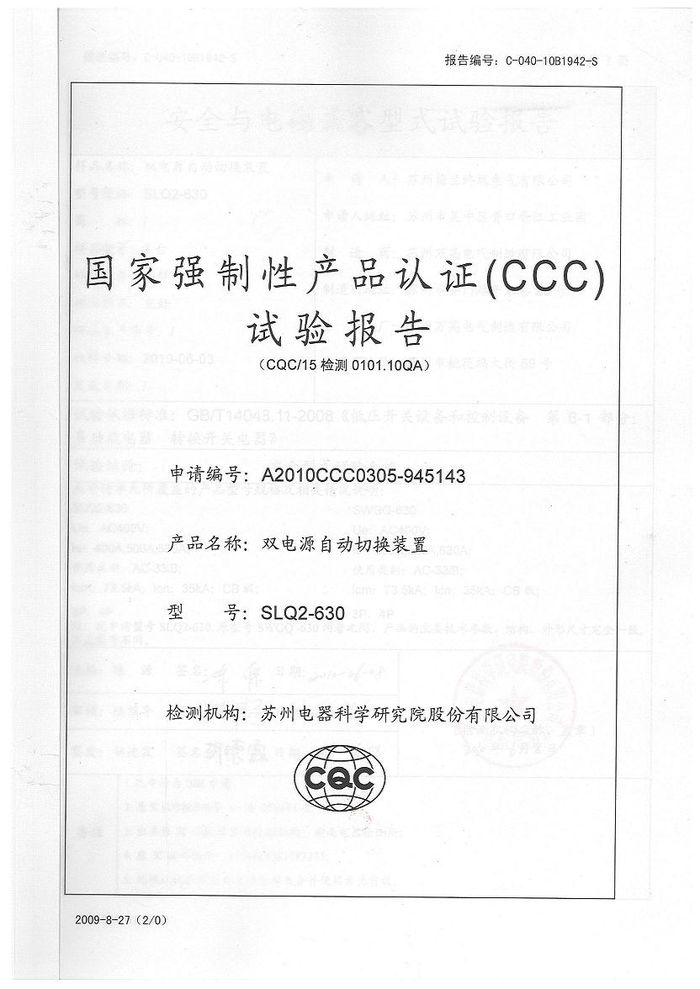 SLQ2-630雙電源資質(zhì)證書(shū)