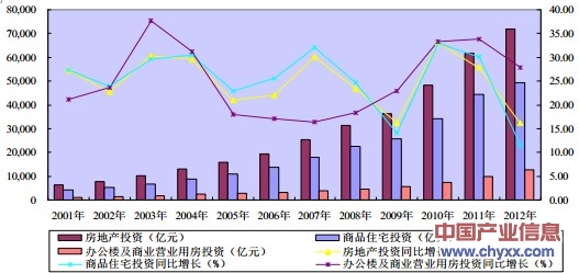 2001-2012年房地產(chǎn)投資、商品住宅投資、辦公樓及商業(yè)營業(yè)用房投資和變化趨勢