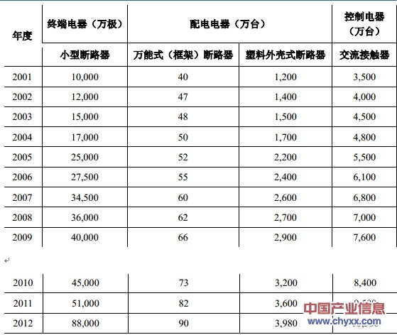 根據(jù)中國電器工業(yè)協(xié)會(huì)的統(tǒng)計(jì),2001 年至 2012 年主要低壓電器產(chǎn)品的產(chǎn)銷量呈逐年上升趨勢,低壓電器產(chǎn)品保持較快速度增長,終端電器、配電電器、控制電器產(chǎn)量復(fù)合增長率分別為 21.86%、11.41%、10.50%,今后較長一段時(shí)間內(nèi)我國低壓電器市場容量仍會(huì)穩(wěn)步增長。