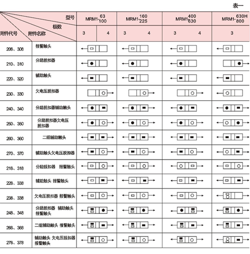 對(duì)MRMl-400、MRMl-630及MRMl-800其中248、348、278、378規(guī)格中輔助觸頭為一對(duì)觸頭(即一常開(kāi)、一常閉),268、368規(guī)格中的輔助頭為三對(duì)觸頭