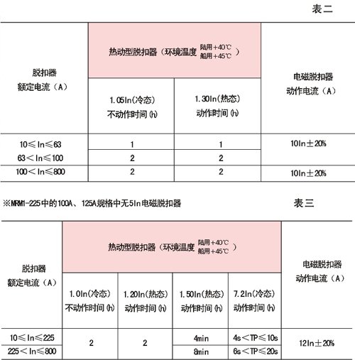 斷路器熱動(dòng)型脫扣器具有反時(shí)限特性;電磁脫扣器為瞬時(shí)動(dòng)作,特性見(jiàn)表二(配電用)及表三(保護(hù)電動(dòng)機(jī)用)
