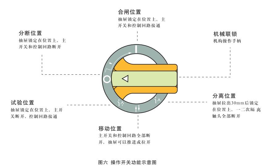 抽屜插入后,將手柄順時(shí)針方向轉(zhuǎn)動(dòng)時(shí),首先到達(dá)“試驗(yàn)位置”(↓),此時(shí)機(jī)構(gòu)將外部電源引入控制回路,用戶通過面板上的安全電器(假如有的話)對(duì)電路進(jìn)行試操作,以確認(rèn)其是否符合要求,由于主開關(guān)尚處于斷開狀態(tài),因此一次回路處于無(wú)電狀態(tài),即使操作結(jié)果與要求不符也不會(huì)損壞設(shè)備,繼續(xù)順時(shí)針方向轉(zhuǎn)動(dòng)到手柄處于水平位置時(shí),即“分?jǐn)辔恢?rdquo;(0)。此時(shí)一次和二次回路均處于無(wú)電狀態(tài),沿順時(shí)針方向繼續(xù)旋轉(zhuǎn)90°則手柄轉(zhuǎn)到“合閘位置”(I),見圖六。